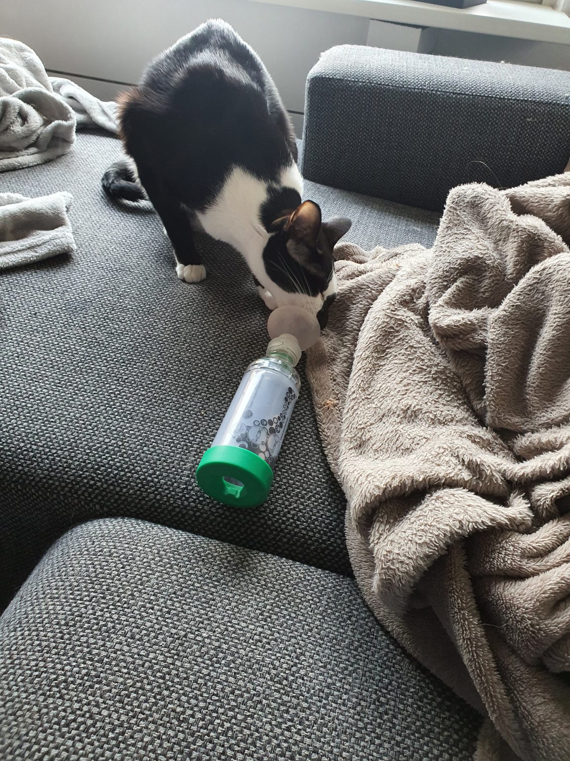 Begin met de inhalator ergens neer te leggen in huis zodat je kat eraan kan snuffelen. Liefst natuurlijk op een plek waar je kat regelmatig komt. Probeer het daarna te koppelen aan iets lekkers. Zet er eerst wat te eten naast en als dit goed gaat, smeer dan wat natvoer aan de binnenkant van het kapje.