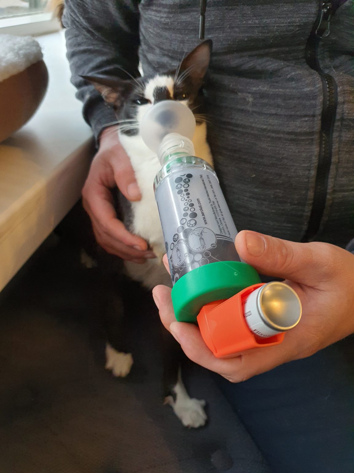 Niet alle katten zijn in eerste instantie gecharmeerd van het apparaat waarmee je de pufjes toedient, een zogenaamde Aerokat®.